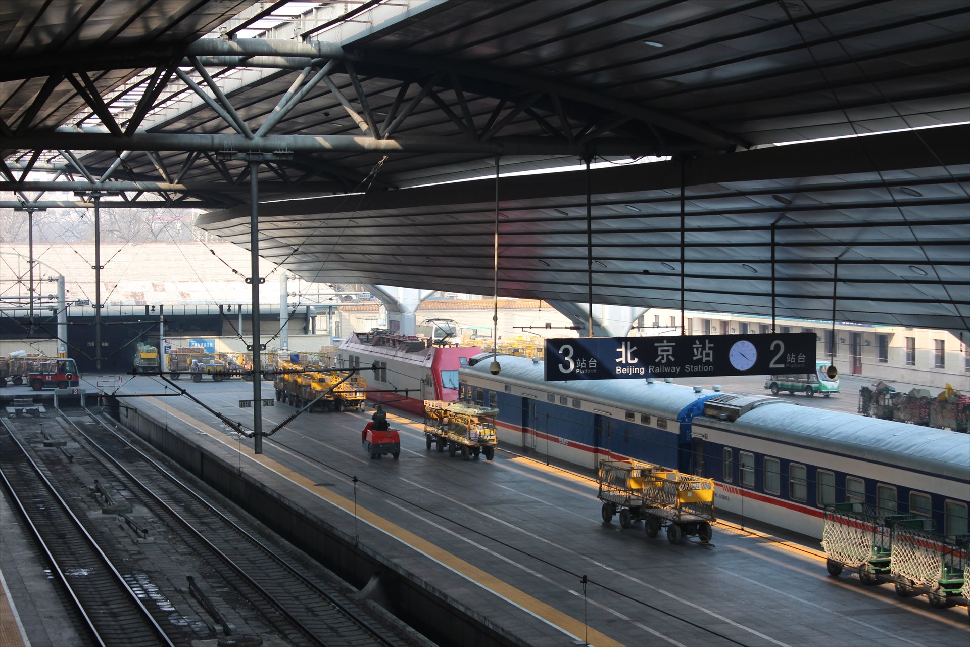 改札が始まり、跨線橋を抜けてホームへ向かう。北京駅は頭端式ターミナルだが、頭端部は荷物の搬入場になっており、一般客は立ち入れない模様である。荷物を積んだ運搬車がホーム上をせわしなく走り回っていた。