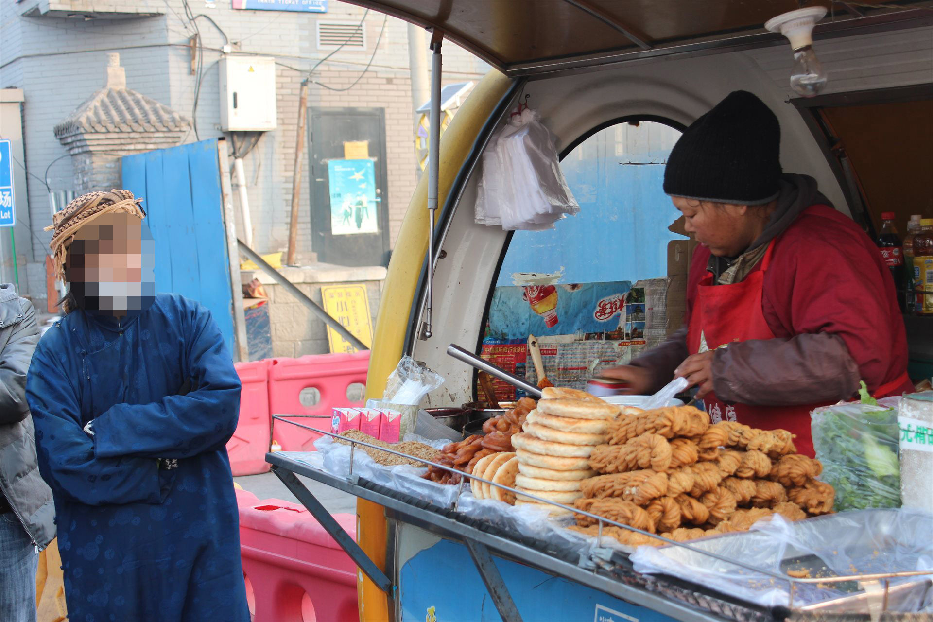 天安門周辺の屋台はローカル感に溢れている。揚げパンがたくさん盛られていた。