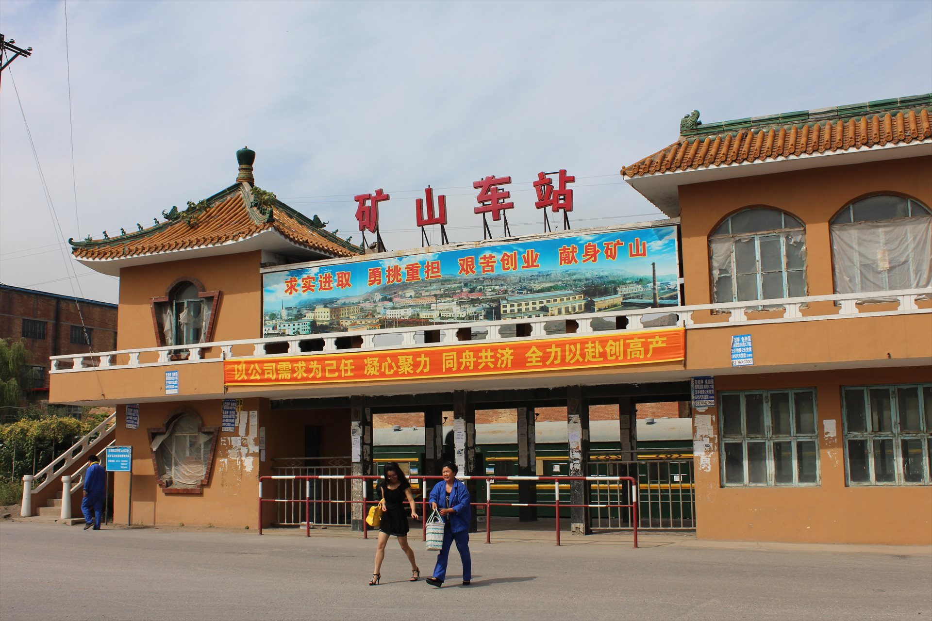 鉱山駅の外に出る。中華風の屋根が特徴的な駅だった。