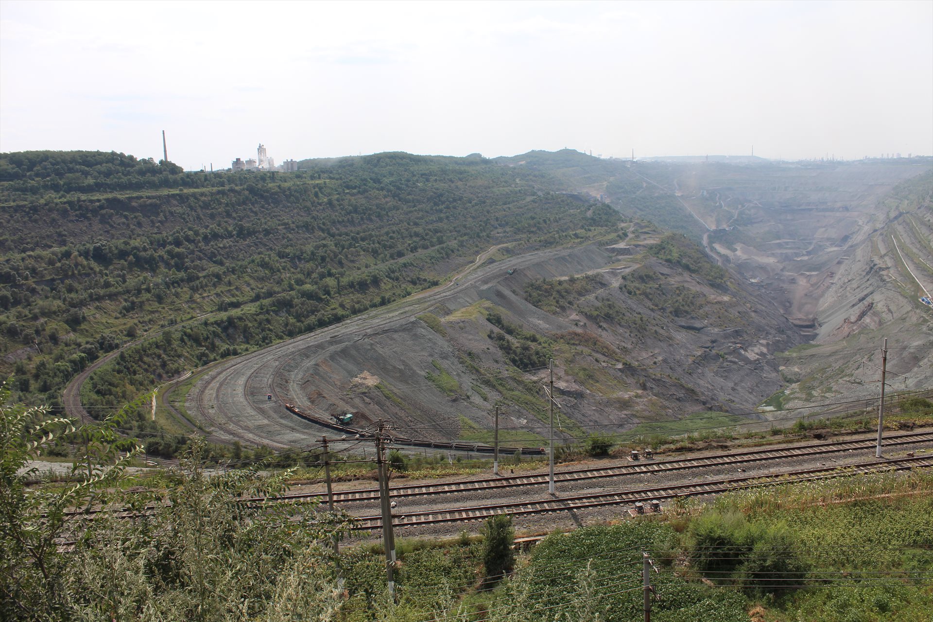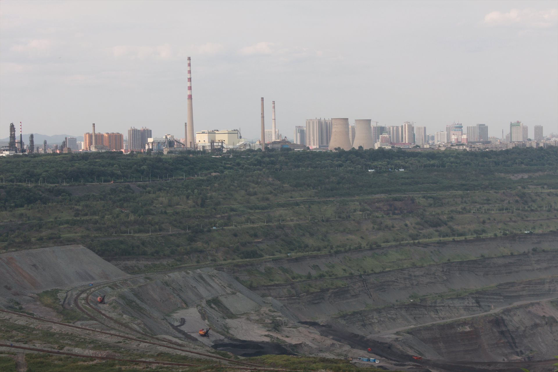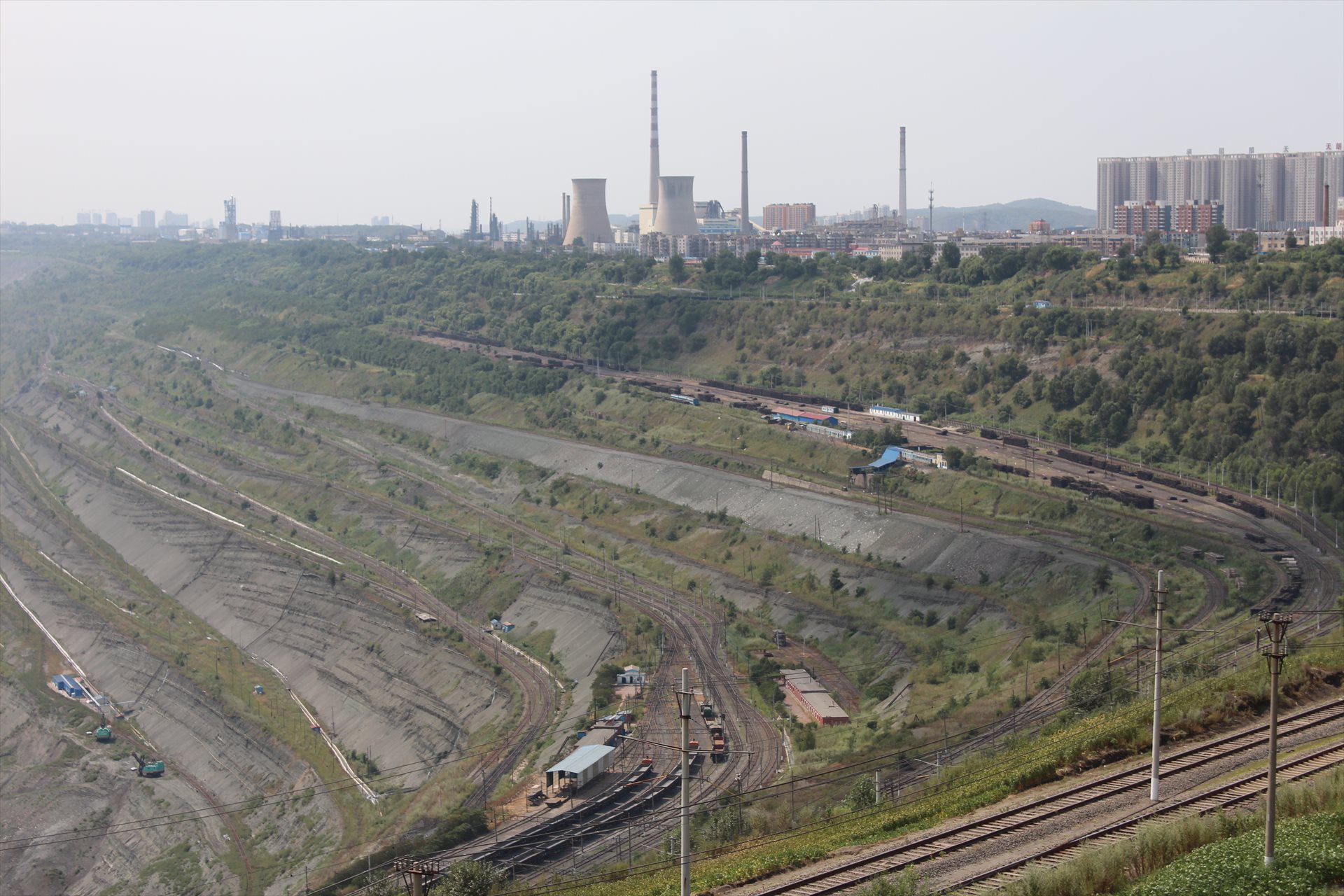 巨大な露天掘りの炭鉱を見た。ここは撫順炭鉱の西露天鉱の東岡展望台である。西露天鉱長さは6km、深さは400m以上に及び、世界でも大規模な部類に入る。