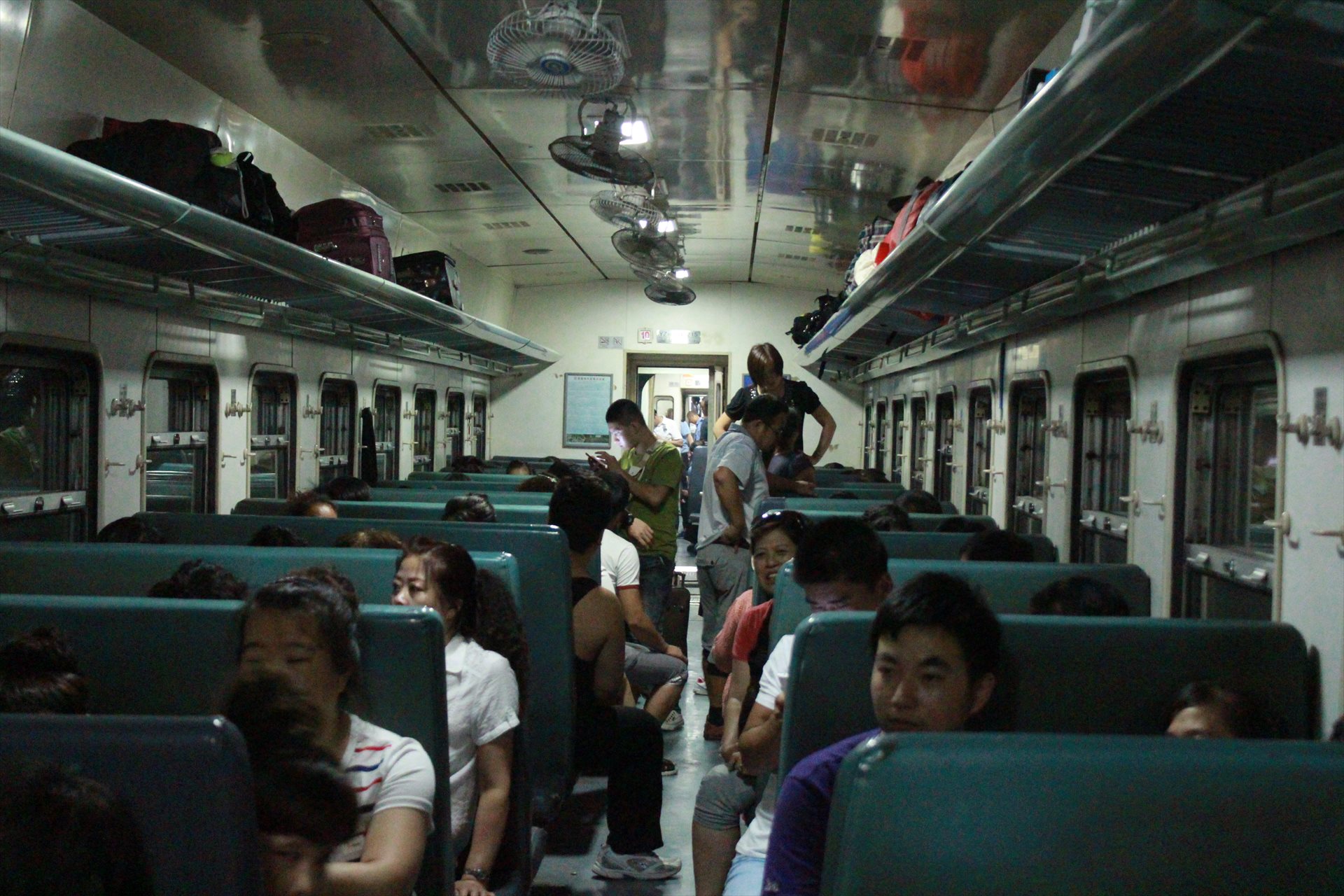 この列車はエアコンなし(非空調)の硬座車、いわゆる「旧型客車」に相当する。扇風機が回る夜のローカル線は雰囲気があってよい。