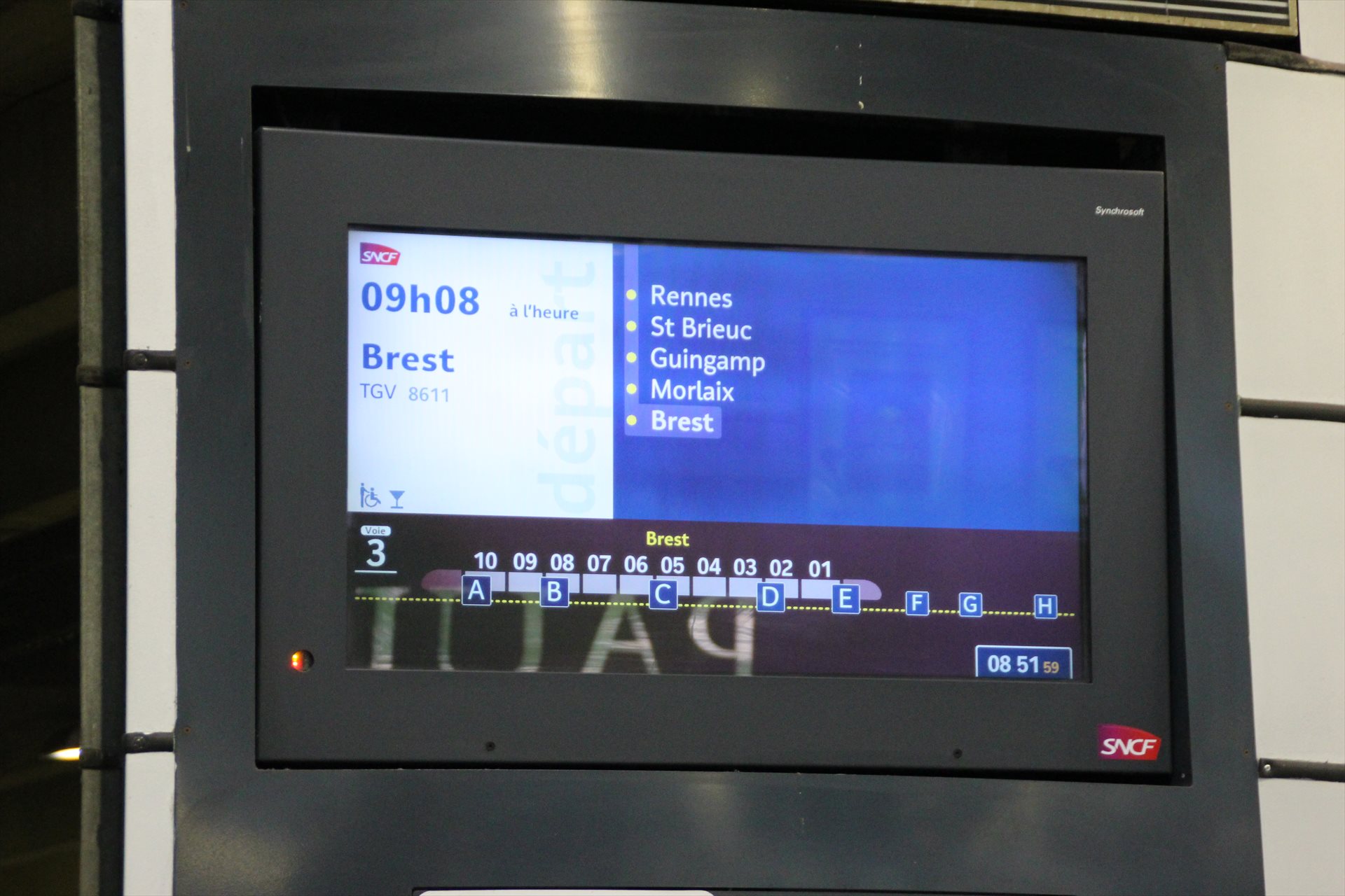 TGV8611列車ブレスト行きに乗車する。パリ・モンパルナスを09:08に出発する。