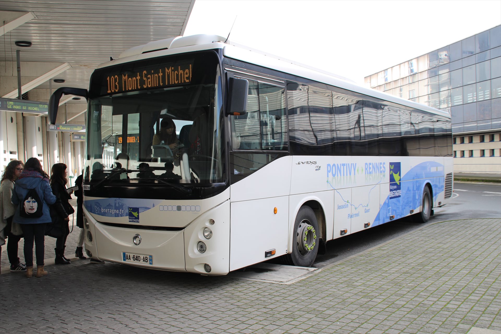 TGVが停まるレンヌ駅からモンサンミシェルへはさらに60kmほど離れている。高速バスで1時間強の旅程となる。